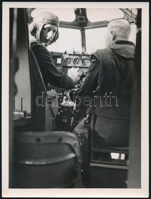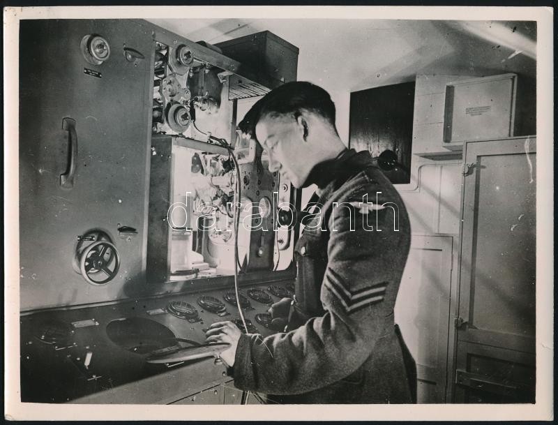 1940-1945 Royal Air Force, a Brit Királyi LégierÅ‘ 2 db sajtófotója, az egyik radart figyelÅ‘ katonával, a másikon Lockheed Hudson gép felderÃtÅ‘ és bombázó gép pilótafülkéjével, sajtófotók, a hátoldalakon pecsétekkel feliratozva, az egyiken magyar nyelvű felirattal is, 15x20 és 20x15 cm
