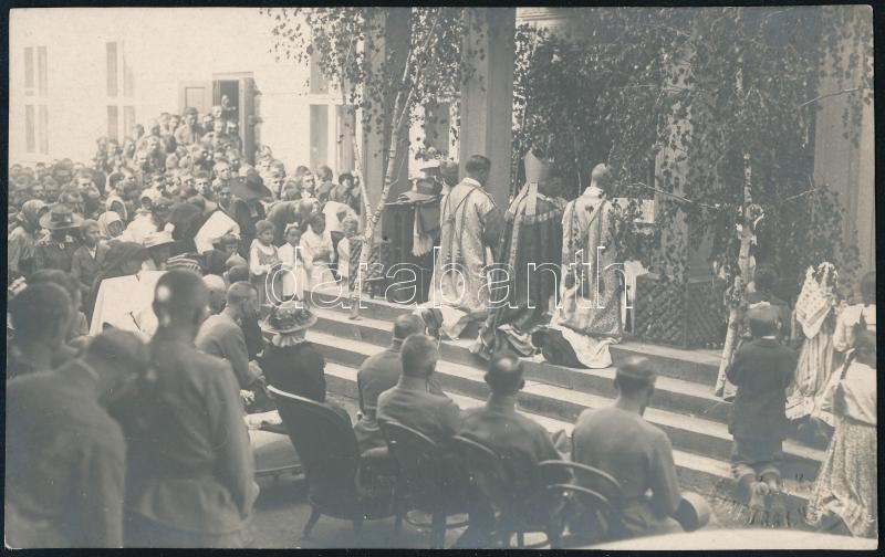 Beschreibung: cca 1916 Tábori mise a cs. és kir. 82. gyalogezred tisztjei részére, fotó az ezred szárazpecsétjével, szép állapotba, 8,5×13,5 cm