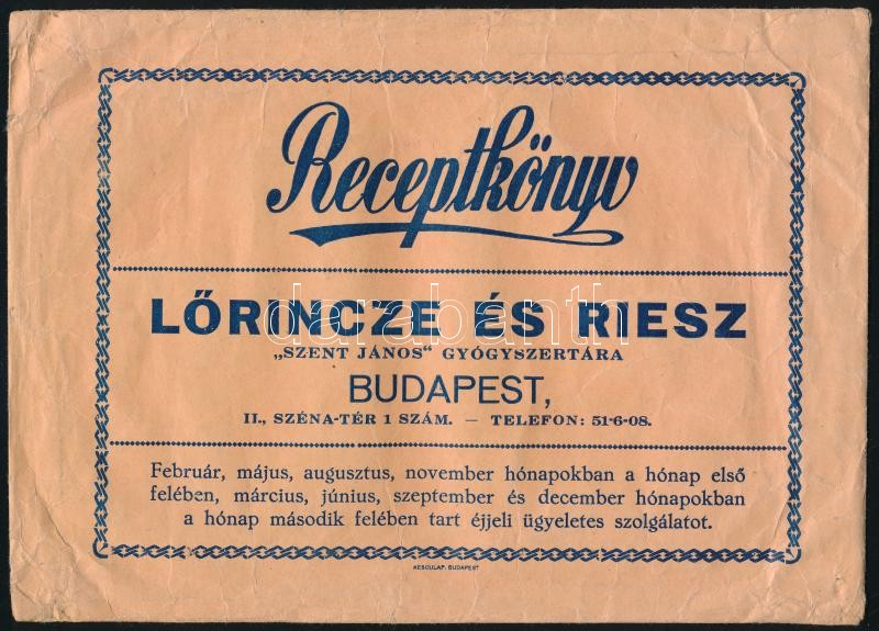 Lőrincze és Riesz "Szent János" Gyógyszertára Receptkönyv borítékja https://www.darabanth.com/de/391-Fernauktion/391.0/Kunst-Dokumente-andere-Sammelgebiete/Werbungen~500022/Lorincze-es-Riesz-Szent-Janos-Gyogyszertara-Receptkonyv-boritekja~II2357608