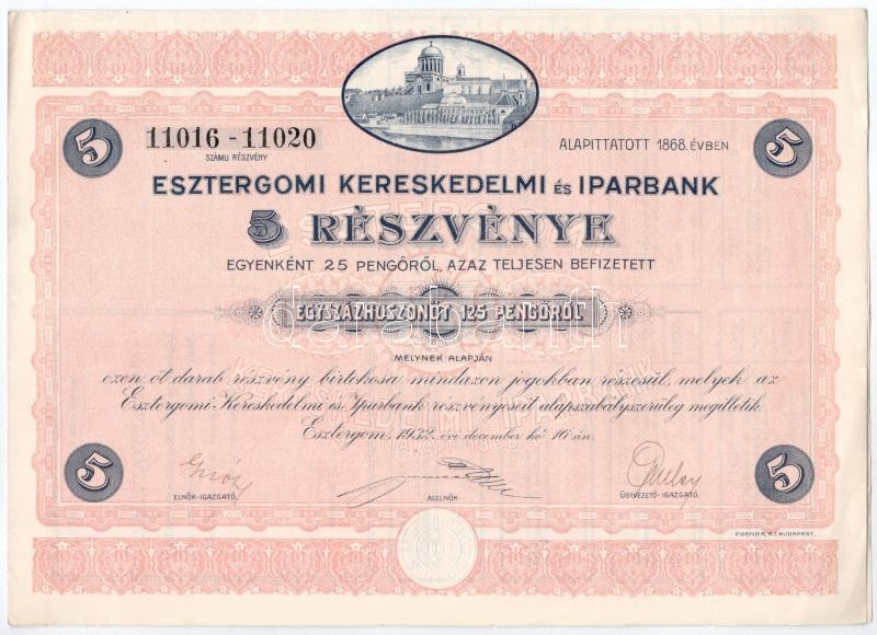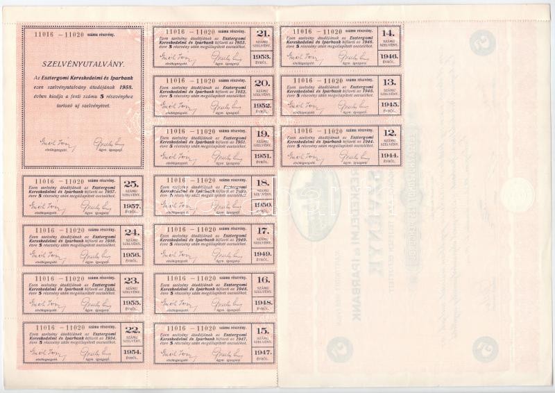 Esztergom 1932. "Esztergomi Kereskedelmi és Iparbank" öt részvénye egy... https://www.darabanth.com/de/391-Fernauktion/391.0/Numismatik/Aktien-und-Tickets~2000022/Esztergom-1932-Esztergomi-Kereskedelmi-es-Iparbank-ot-reszvenye-egyben-125P-rol-szarazpec~II2364523