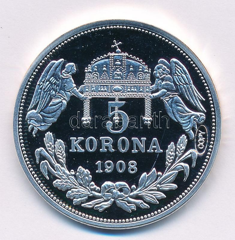 Beschreibung: DN "Osztrák-Magyar Monarchia pénzei utánveretben - 1908. 5 Korona" ezüstözött Cu-Ni emlékérem "COPY" beütéssel, tanúsítvánnyal T:PP fo.