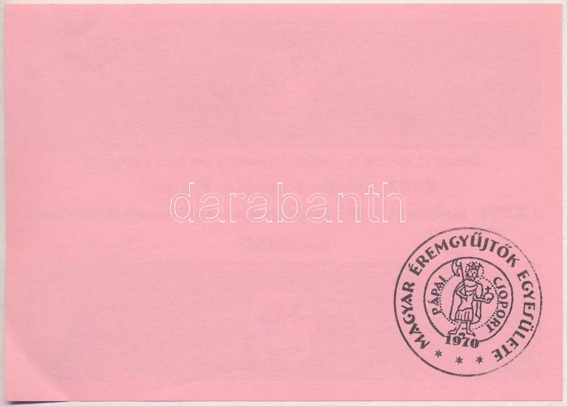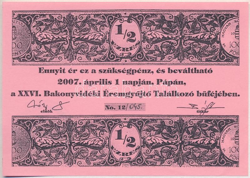Pápa 2007. "26. Bakonyvidéki Éremgyűjtő Találkozó" 1/2 Ezres alkalmi p... https://www.darabanth.com/de/391-Fernauktion/391.0/Numismatik/Notgeld-aus-Papier-und-Metall~2000023/Papa-2007-26-Bakonyvideki-Eremgyujto-Talalkozo-12-Ezres-alkalmi-penz-045-kezi-sorsz~II2362208