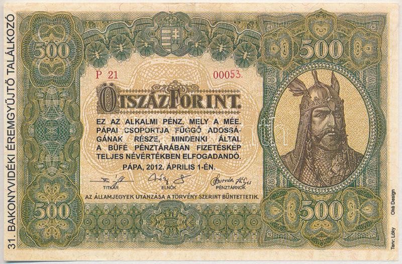 Pápa 2012. "MÉE Pápai csoport / 31. Bakonyvidéki Éremgyűjtő Találkozó" 500Ft alkalmi pénz, hátoldalán Magyar Éremgyűjtők Egyesülete - Pápai Csoport 1970" felülbélyegzéssel, "P21 00053" T:I
