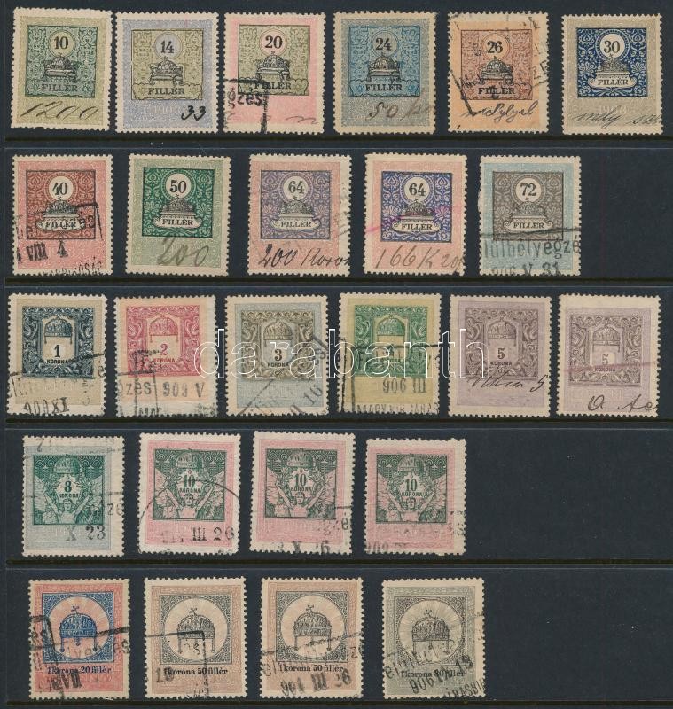 Beschreibung: 29 db illetékbélyeg, köztük sor is, berakólapon