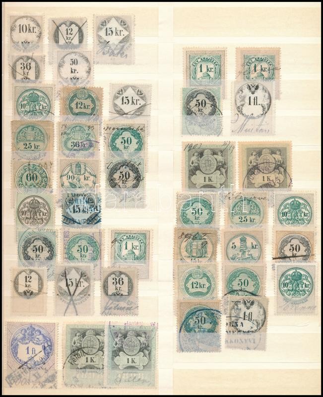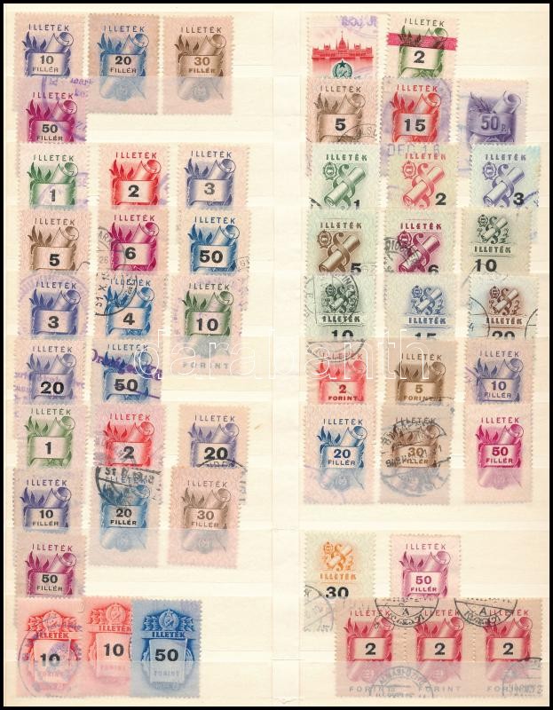 Beschreibung: 50 db illetékbélyeg, köztük sorok is, nagyalakú berakólap mindkét oldalán