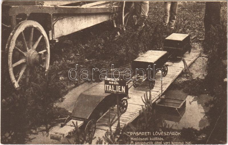 Beschreibung: Budapest II. Pasaréti Lövészárok, Hadászati kiállítás, a sappeurök által vert katonai híd "Einmarsch nach Italien"