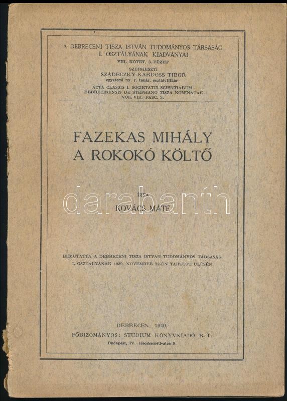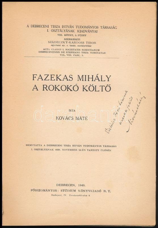 Kovács Máté: Fazekas Mihály a rokokó költő. A szerző, Kovács Máté (1906-1972) könyvtáros, művelődéspolitikus által dedikált. "Vietórisz Józsi bácsinak tisztelete jeléül Kovács Máté". Debrecen, 1940, Stúdium, 53+2 p. Kiadói papírkötés, kissé hiányos, kissé szakadt gerinccel.