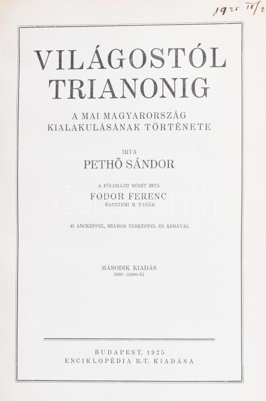 Pethő Sándor: Világostól Trianonig. A mai Magyarország kialakulásának története. A földrajzi részt írta Fodor Ferenc. Bp., 1925, Enciklopédia Rt. Második kiadás. Kiadói kissé kopott aranyozott egészvászon-kötésben.