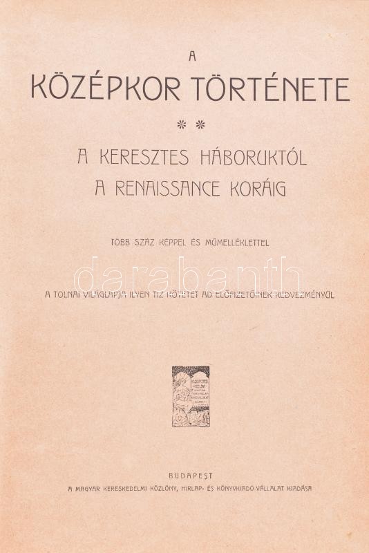 Tolnai világtörténelme: A középkor története. II. köt.: A keresztes háborúktól a renaissance koráig. Bp., én., Magyar Kereskedelmi Közlöny. Átkötött egészvászon-kötés, az átkötéshez az eredeti borítót felhasználták.
