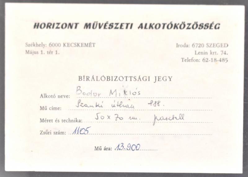 Beschreibung: Bodor Miklós (1925-2010): Szanki útban (Kiskunfélegyháza környéke). Pasztell, papír, jelzett és datált (Bodor 988), üvegezett fa keretben. Hátoldalán Horizont Alkotóművészeti Közösség, Kecskemét címkéjével. 50×70 cm