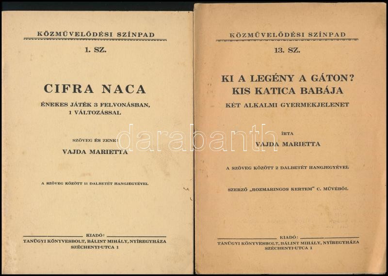 1912-1947 Vegyes nyomtatvány tétel, 3 db: Közművelődési Színpad 2 száma (1. sz, 13 sz.): Vajda Marietta: Cifra Naca. Énekes játék 3 felvonásban, 1 változtatással. Nyíregyháza,1946, Tanügyi Könyvesbolt, 45+2 p. ; Vajda Marietta: Ki a legény a gáton? Kis katica babája. Két alkalmi gyermekjelenet. Nyíregyháza,1947, Tanügyi Könyvesbolt, 8 p. ; + Nagy József: Polgáriskolák 1910-11. évi tanulmányutjai. Bp., 1912, Stephaneum, 11 p.