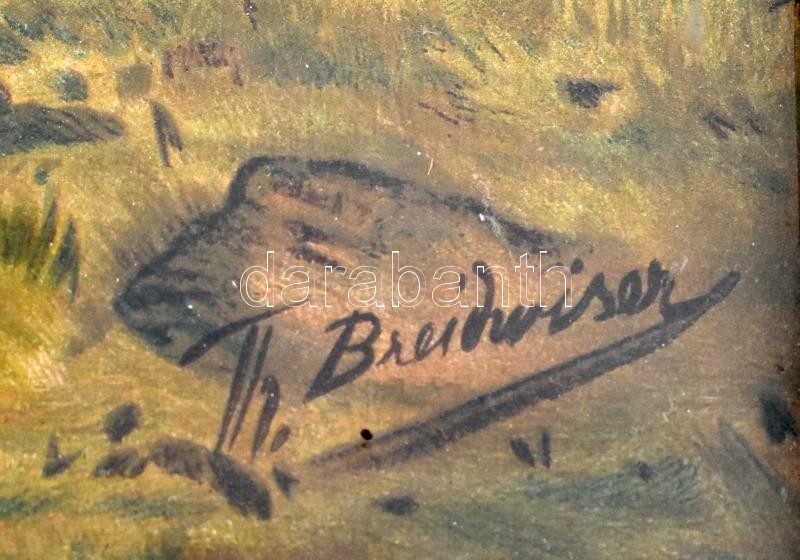 Beschreibung: cca 1900 Th Breitwieser (?) jelzéssel: Vasárnapi vadászok (humoros jelenet). Olajnyomat, papír. Sérült. Üvegezett fa keretben. 40x51,5 cm