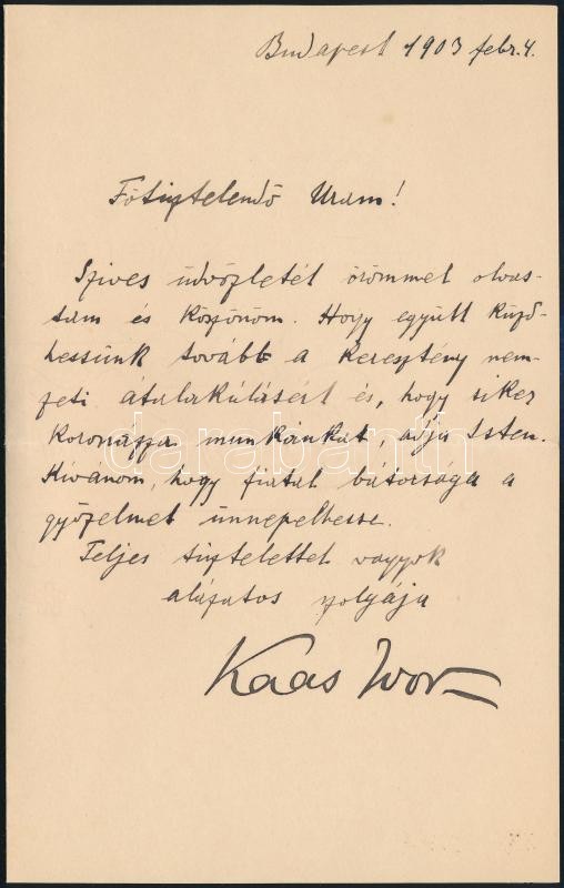 1903 báró Kaas Ivor (1842-1910) újságíró, politikus, a Katolikus Néppárt alapító tagja saját kézzel írt és aláírt levele Keményffy K. Dániel hitoktató, egyházi író , az Esztergom című politikai hetilap alapítója részére a keresztény nemzeti átalakulásért vívott harcot köszönve, szép állapotban