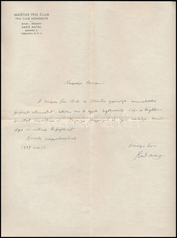 1939. dec. 24 Radó Antal (1862-1944) Ãró, költÅ‘, irodalomtörténész, a Magyar PEN Club elnökének autográf kondoleálói sorai GerÅ‘ Ödönnének, GerÅ‘ Ödön (1863-1939) művészeti Ãró özvegyének. Magyar PEN Club elnök fejléces papÃron, Magyar PEN Club elnök feliratú eredeti borÃtékban.