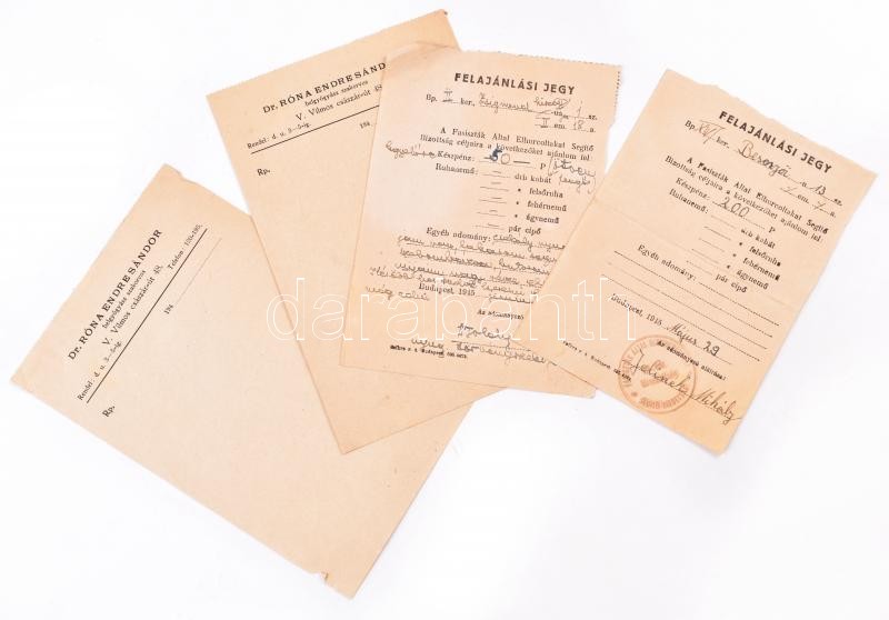 1945 Fasiszták által Elhurcoltak Segítő Bizottság, 2 db felajánlási jegy + 2 db kitöltetlen recept, Róna Endre Sándor belgyógyász, Vilmos császár út, Bp.