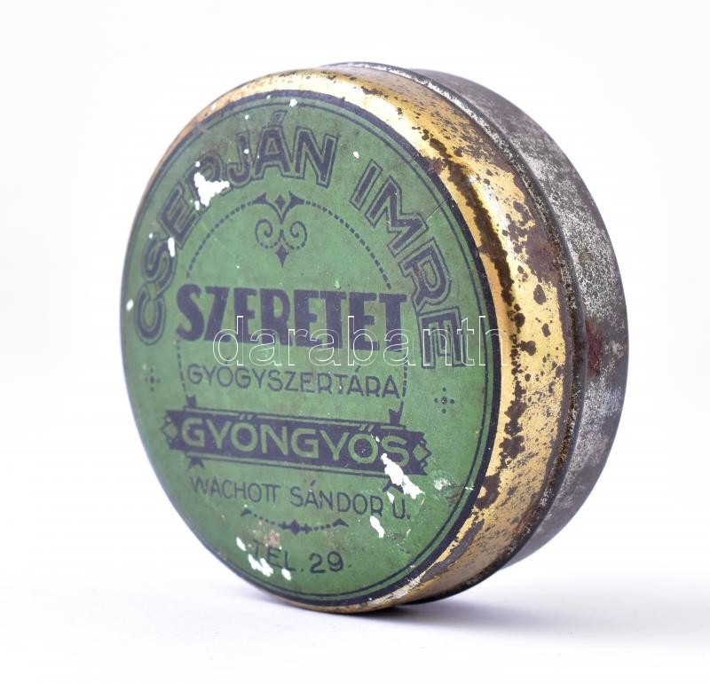 Beschreibung: 1925 Cserján Sándor "Szeretet" Gyógyszertára Gyöngyös fém doboz, kopásnyomokkal, d: 5,5 cm