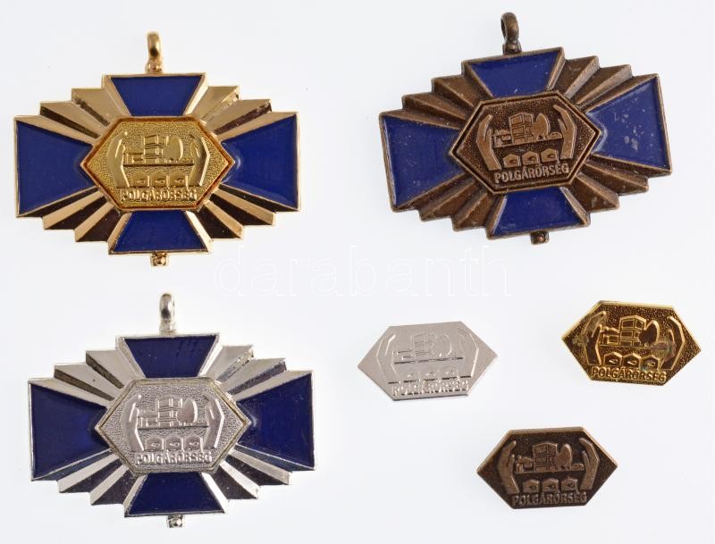 Beschreibung: DN "Országos Polgárőr Szövetség" arany-, ezüst- és bronzfokozatú műgyantás fém kitüntető érem és fém jelvény (6xklf) T:1--2-