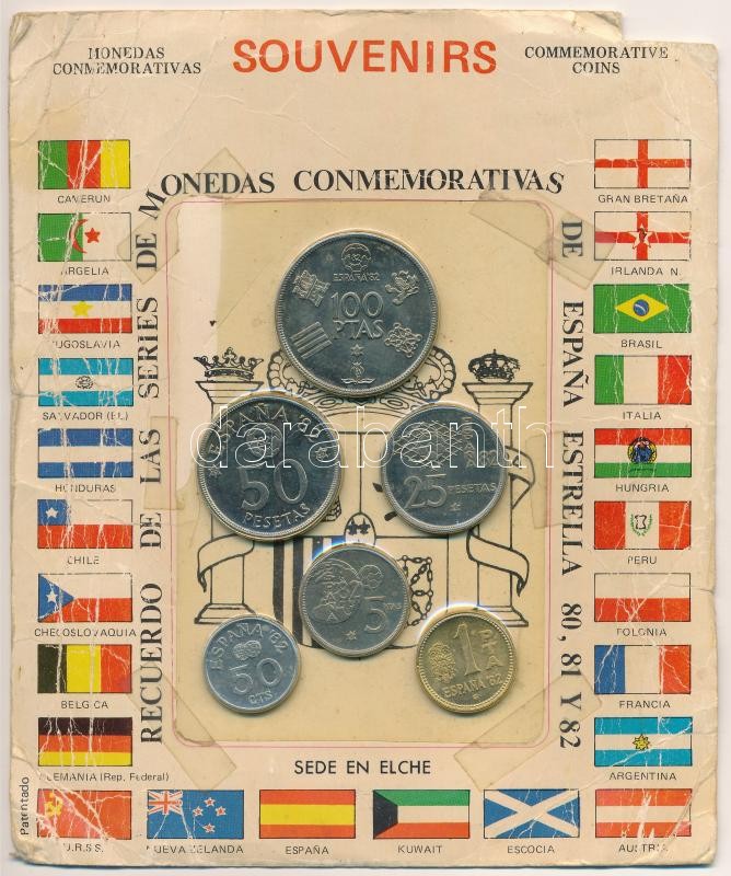 Spanyolország 1980. 50c-100P (6xklf) "1982 Világbajnokság" forgalmi sor rossz állapotú lapon T:1,1- Spain 1980. 50 Centimos - 100 Pesetas (6xdiff) "World Cup 1982" coin set on a sheet of poor condition C:UNC,AU