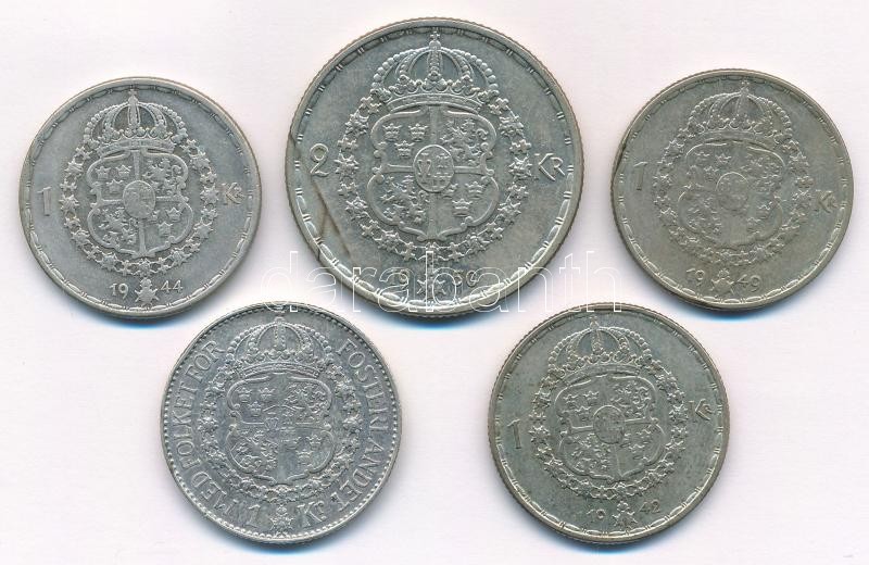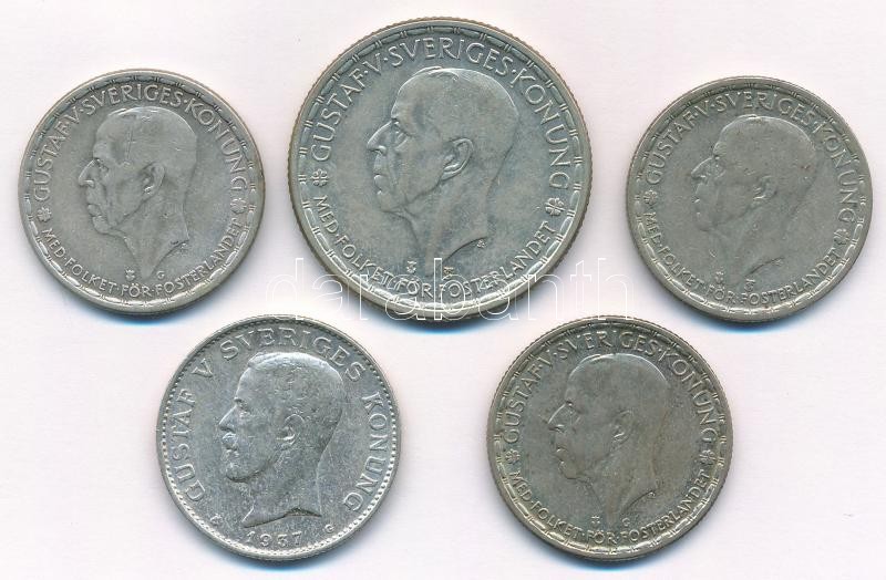 Svédország 1937-1949. 1K Ag "V. Gusztáv" (4xklf) + 1950. 2K ... https://www.darabanth.com/de/392-Fernauktion/392.0/Numismatik/Weltweit-Munzen~2000014/Svedorszag-1937-1949-1K-Ag-V-Gusztav-4xklf-plus-1950-2K-Ag-V-Gusztav-T2-2--Sweden-1937-~II2376622