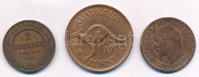 Vegyes: Franciaország 1862K 5c Cu "III. Napóleon" + Orosz Birodalom 1911. 2k Cu + Ausztrália 1952. 1p Cu "VI. György" T:3