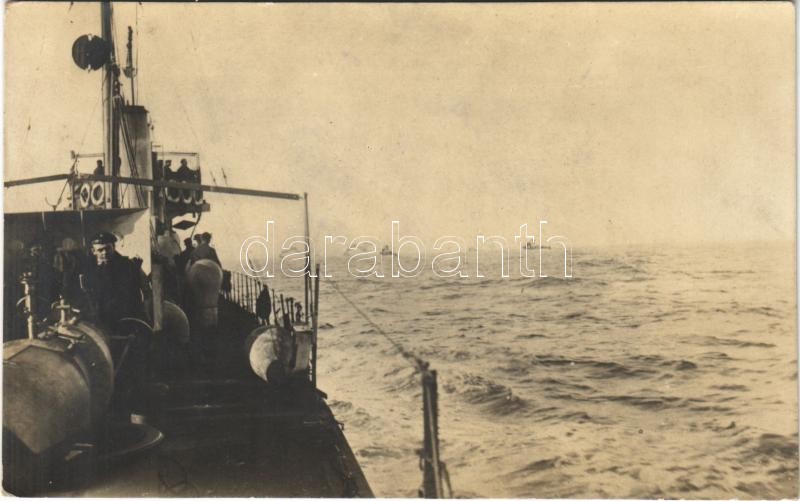 Beschreibung: Első világháborús osztrák-magyar torpedónaszád fedélzete matrózokkal / K.u.K. Kriegsmarine Torpedoboot, Matrosen / WWI Austro-Hungarian Navy torpedo boat, mariners on deck. photo (fl)