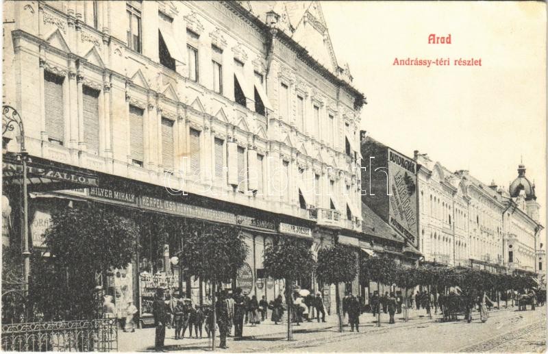 Arad, Andrássy tér, Központi szálló, Hilyer Mihály, Kerpel Izsó könyv és papírkereskedés, Singer Sándor, Sugár József, Weinberger János és Lengyel Lőrinc üzlete / square, hotel, shops (Rb)
