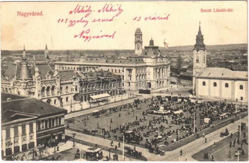 Nagyvárad, Oradea; Szent László tér, Városháza, piac, villamos, takarékpénztár. Rigler József Ede kiadása / square, town hall, market, tram, savings bank (Rb)