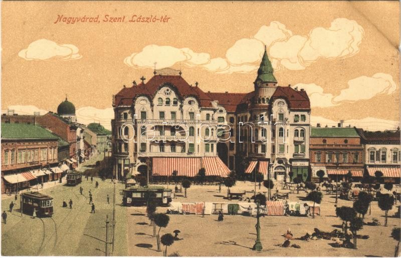 Nagyvárad, Oradea; Szent László tér, piac, Fekete Sas szálloda, villamos, Cziller Imre üzlete, gyógyszertár, zsinagóga. Rákos Vilmos kiadása / square, market, hotel, tram, shops, pharmacy, synagogue