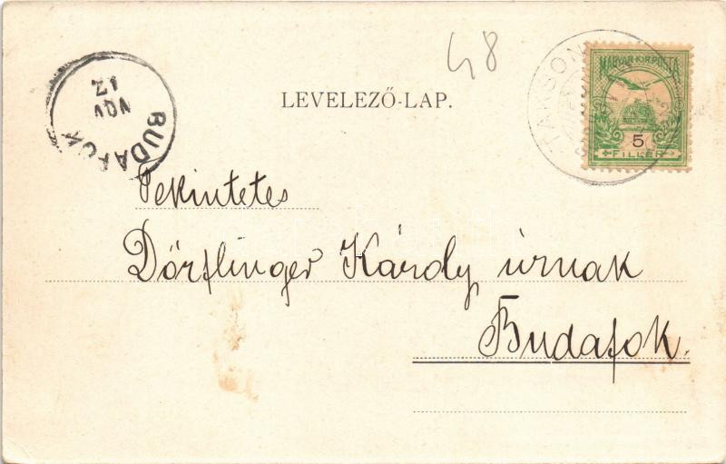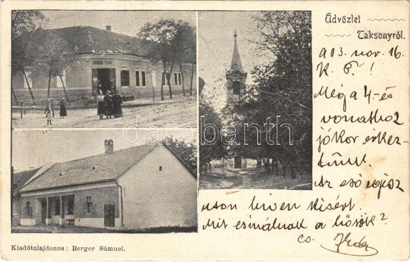 Beschreibung: 1903 Taksony, templom, Berger Sámuel üzlete és saját kiadása (EK)