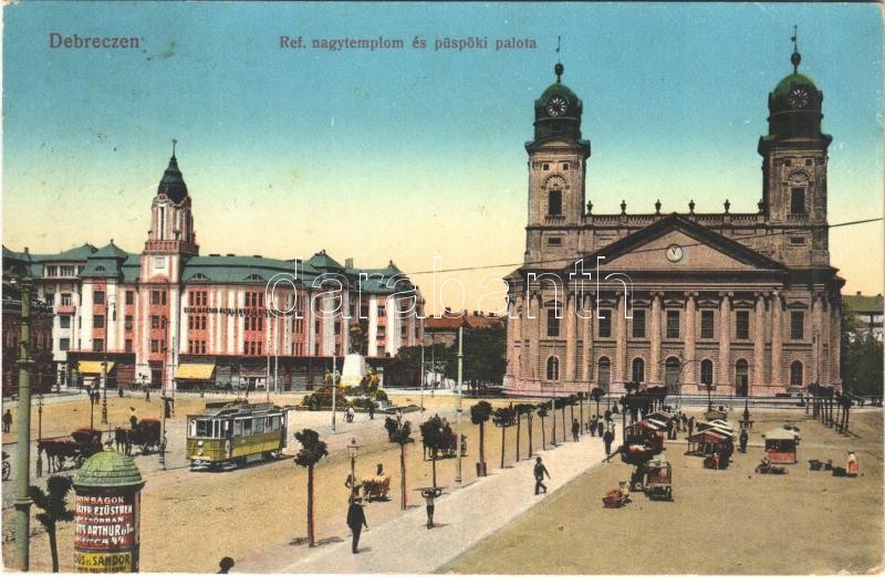 1915 Debrecen, Református nagytemplom és püspöki palota, villamos, piac, Első Magyar Általános Biztosító Társaság Főügynöksége, Bottó Kornél és Társa üzlete. Vasúti levelezőlapárusítás 20. sz. (EK)