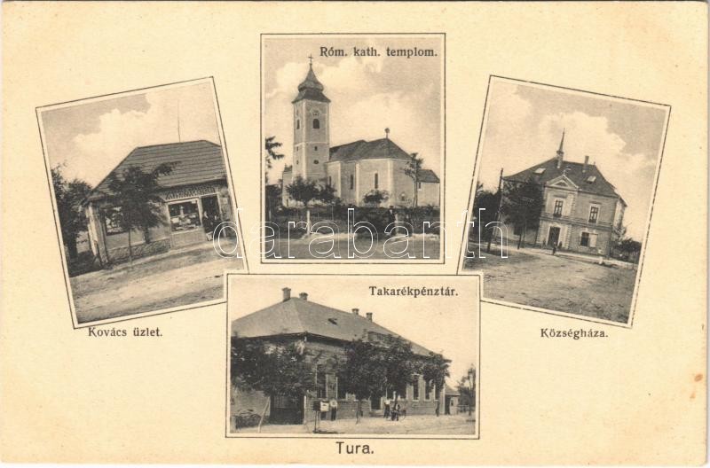 Tura, Takarékpénztár, községháza, római katolikus templom, Kovács üzle... https://www.darabanth.com/de/393-Fernauktion/393.0/Ansichtskarten/Ungarn~1500005/Tura-Takarekpenztar-kozseghaza-romai-katolikus-templom-Kovacs-uzlete~II2381857