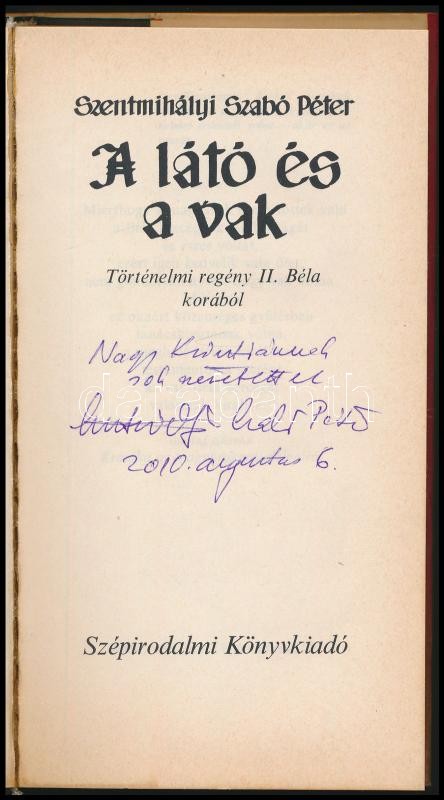 Szentmihályi Szabó Péter: A látó és a vak. Történelmi regény II. Béla korából. Bp., 1983, Szépirodalmi. Első kiadás. Kiadói egészvászon-kötés, kiadói papír védőborítóban. A szerző, Szentmihályi Szabó Péter (1945-2014) által dedikált.