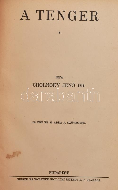 Cholnoky Jenő: A tenger. Bp., 1931, Singer és Wolfner. 323 p. Kiadói aranyozott egészvászon sorozatkötésben, kissé kopott borítóval, előzéklap és címlap kijár, utolsó néhány lap foltos.