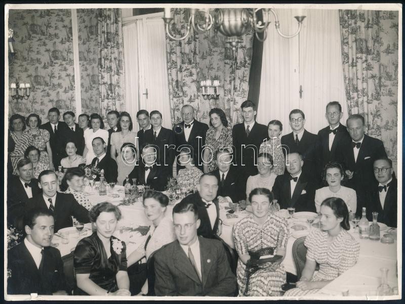 Beschreibung: 1940 Budapest, Gundel étterem, érettségi bankett a kisteremben, hátoldalon feliratozott, pecséttel jelzett fotó, 23,5x17,5 cm