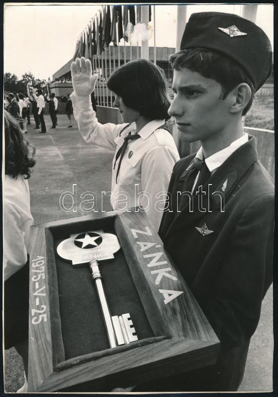 Beschreibung: 1975 Úttörők átveszik a Zánkai Úttörőváros kulcsát, publikált fotó, hátoldalon feliratozva, merevítőpapírral, felszínén papírfolttal, 24×17 cm