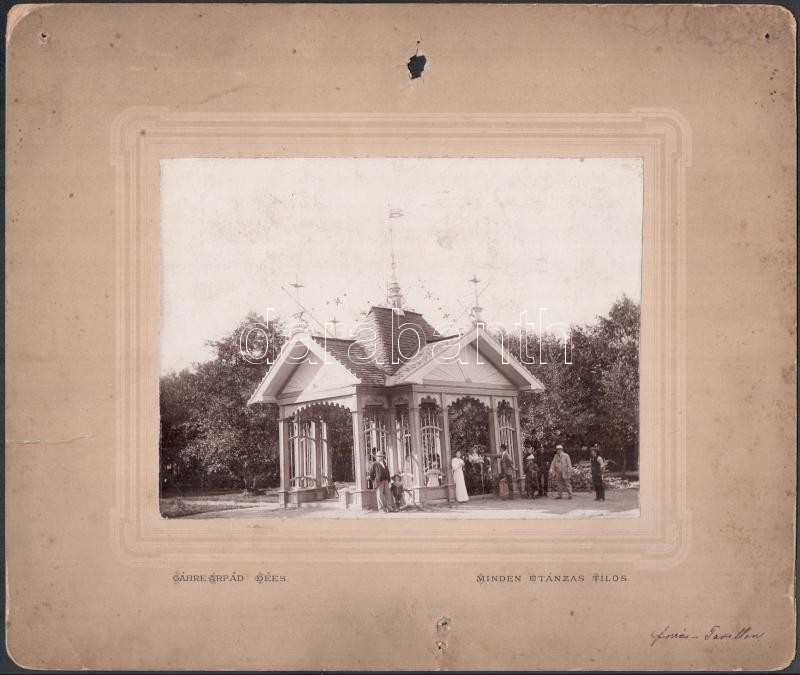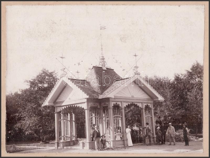 Beschreibung: cca 1900 Dés, forráspavilon, kartonra kasírozott fotó Gábre Árpád műterméből, sérült karton, feliratozva, 15,5×20 cm
