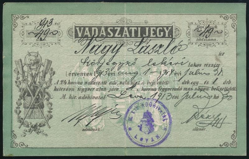 Beschreibung: 1913 Vadászati jegy Nagy László lekéri (Felvidék, Nyitra megye) körjegyző részére kiállítva, enyhén hajtva, jó állapotban