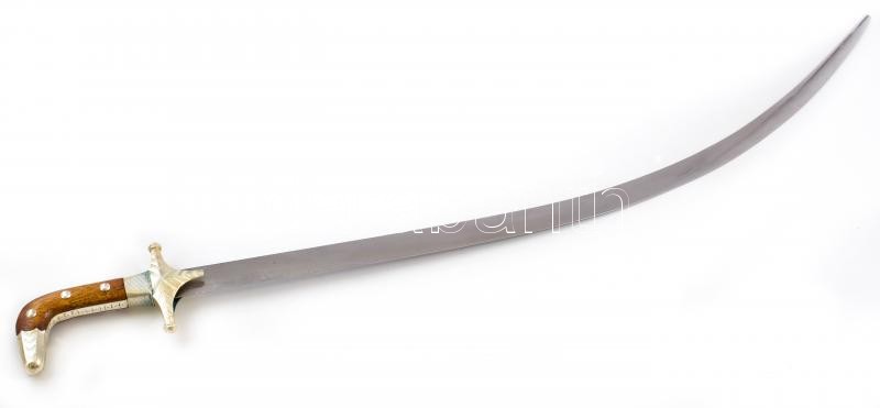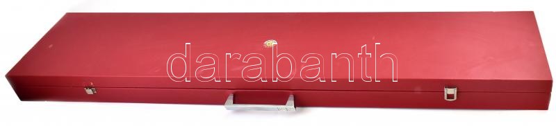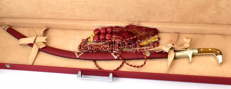 Beschreibung: XX. sz vége: Arab díszkard Katarból. Jelzett, hüvellyel, kardbojtokkal 99 cm. Díszdobozban, csat hiányzik a dobozról. Szép állapotban.