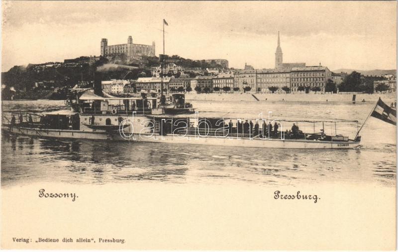 Pozsony, Pressburg, Bratislava; SMS Szamos a Császári és Királyi Haditengerészet monitor típusú hadihajója. Dunaflottilla / K.u.K. Kriegsmarine Donauflottille. Bediene dich allein / SMS Szamos Austro-Hungarian Navy river guard monitor