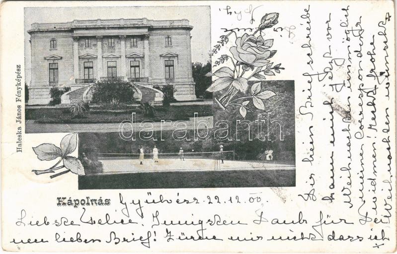 Beschreibung: 1900 Kápolnás, Capalnas, Caparias, Capolnas; Mocsonyi-Teleki kastély, teniszpálya teniszezőkkel. Haleska János fényképész / castle, tennis court. floral