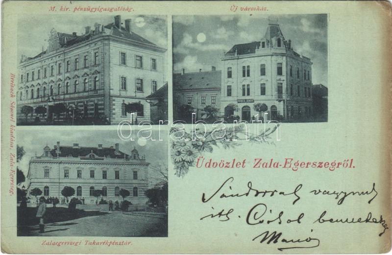 Beschreibung: 1900 Zalaegerszeg, Zala-Egerszeg; M. kir. pénzügyigazgatóság, új városház, takarékpénztár, este. Breisach Sámuel kiadása, floral (EK)
