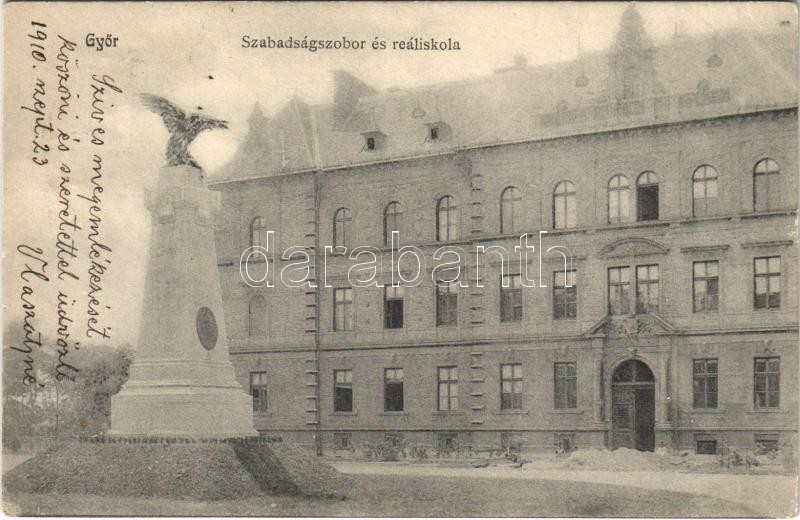 1910 Győr, Szabadság szobor és reáliskola. Milanes Iván kiadása https://www.darabanth.com/de/394-Fernauktion/394.0/Ansichtskarten/Ungarn~1500005/1910-Gyor-Szabadsag-szobor-es-realiskola-Milanes-Ivan-kiadasa~II2388549