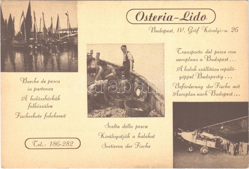 Budapest V. Osteria Lido Magyar-Olasz vendéglő reklámja, halászbárkák felkészülve, halak kiválogatása, halak szállítása repülőgéppel. Gróf Károlyi utca 26.