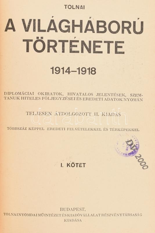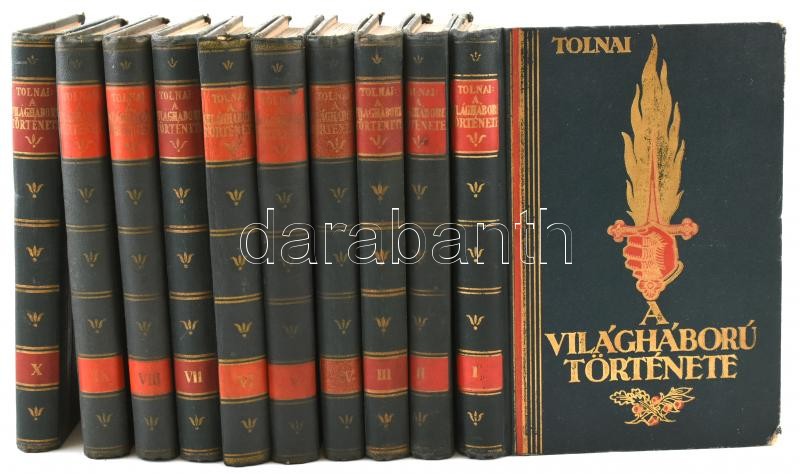 Tolnai: A világháború története 1914-1918. Diplomáciai okiratok, hivatalos jelentések, szemtanúk hiteles följegyzései és eredeti adatok nyomán. Átdolgozott második kiadás, I-X. kötet. Bp, [1928-1930], Tolnai Nyomdai Műintézet és Kiadóvállalat Rt. Számos fekete-fehér fotóval, térképpel. Aranyozott, festett kiadói félvászon kötésben, a borítókon kopásokkal, néhány részben elvált kötéssel.