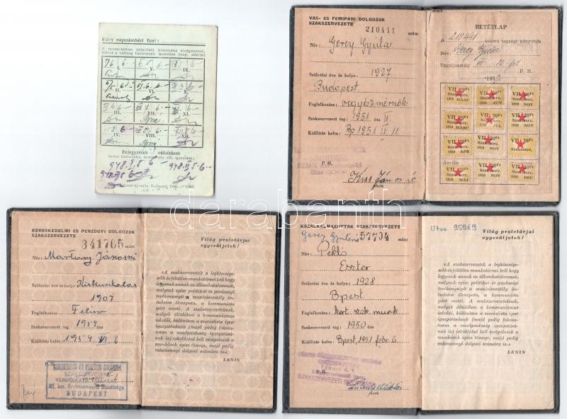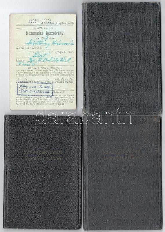 cca 1947-1955 Közmunka igazolvány és 3 db szakszervezeti tagsági könyv https://www.darabanth.com/de/394-Fernauktion/394.0/Kunst-Dokumente-andere-Sammelgebiete/Dokument~500019/cca-1947-1955-Kozmunka-igazolvany-es-3-db-szakszervezeti-tagsagi-konyv~II2387336