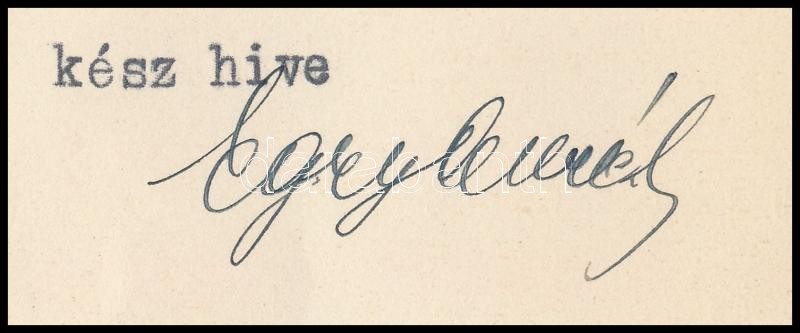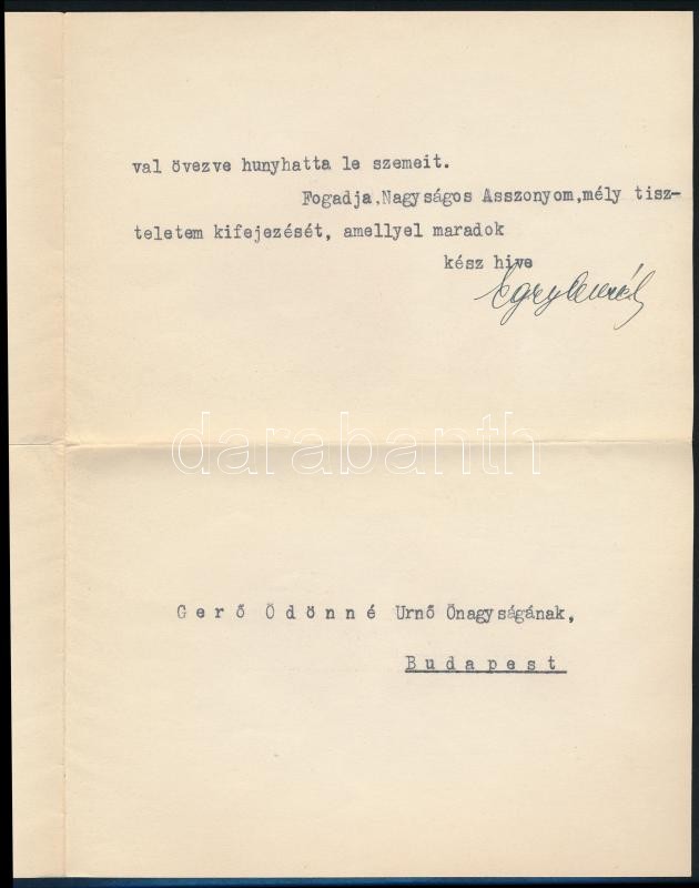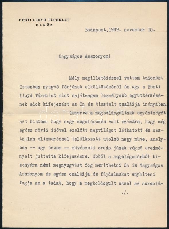 1939. nov. 10 Egry Aurél (1874-?) ügyvéd, jogtudós, Felsőház 1927. évi megalakulása óta annak tagja, a Pesti Lloyd Társulat elnökének kondoleáló levele Gerő Ödönnének, Gerő Ödön (1863-1939), a Pester Lloyd műkritikusa özvegyének, amelyben megemlékezik Gerőről és kitér a halála előtt megjelent Művészetről, Művészekről c. könyvére: "(...) Ismerve a megboldogultnak egyéniségét, azt hiszem, hogy nagy megelégedés volt számára, hogy még egész rövid idővel ezelőtt napvilágot láthatott és osztatlan elismeréssel találkozott utolsó nagy műve, amelyben - ugy érzem - művészeti credo-jának végső eredményeit juttatta kifejezésre . (...)" Bő egy géppel írt oldal Pesti Lloyd Társulat Elnök fejléces papíron, Egry Aurél autográf aláírásával, eredeti Pesti Lloyd Társulat Elnök feliratú borítékban.