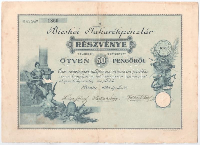 Bicske 1926. "Bicskei Takarékpénztár" részvénye 50P-ről, szárazpecsétt... https://www.darabanth.com/de/394-Fernauktion/394.0/Numismatik/Aktien-und-Tickets~2000005/Bicske-1926-Bicskei-Takarekpenztar-reszvenye-50P-rol-szarazpecsettel-TIII-szakadas-fo~II2388496