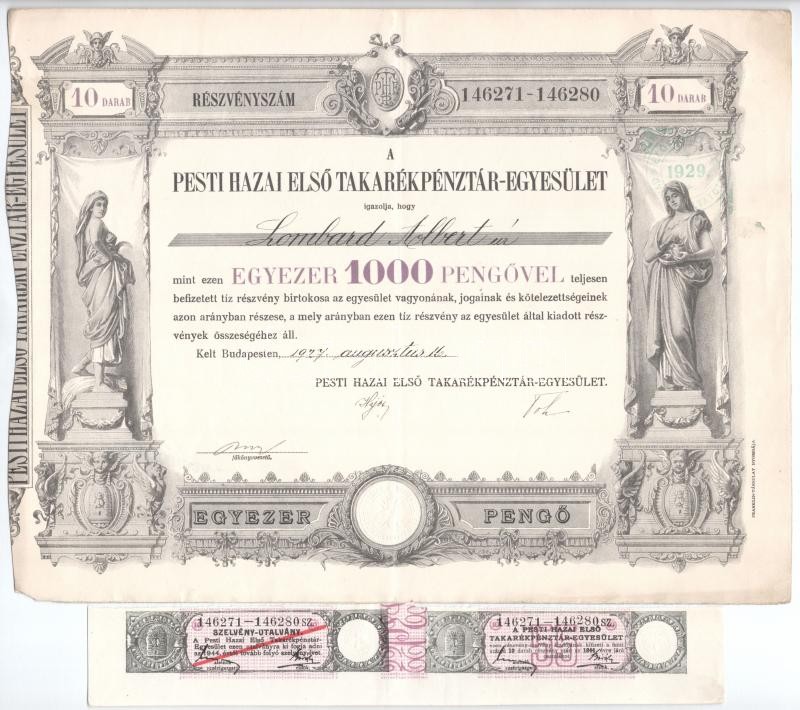 Budapest 1924. "Pesti Hazai Első Takarékpénztár-Egyesület" névre szóló... https://www.darabanth.com/de/394-Fernauktion/394.0/Numismatik/Aktien-und-Tickets~2000005/Budapest-1924-Pesti-Hazai-Elso-Takarekpenztar-Egyesulet-nevre-szolo-reszvenye-200000K-~II2390615