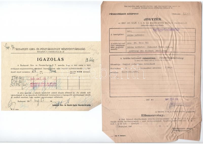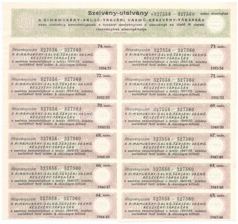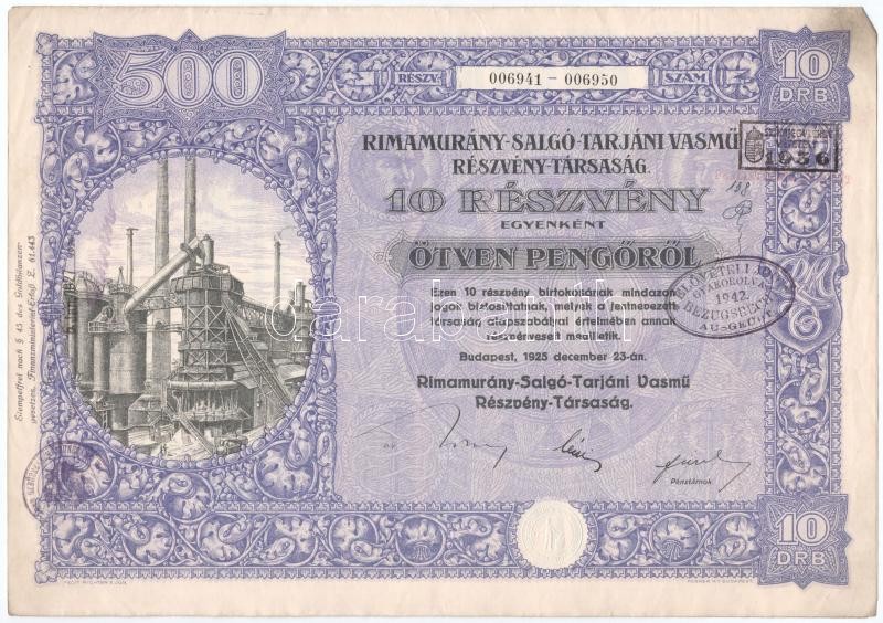 Budapest 1925. "Rimamurány-Salgó-Tarjáni Vasmű Részvény-Társaság" tíz részvénye egyenként 50P-ről, összesen 500P-ről, szelvényekkel, bélyegzéssel és szárazpecséttel (2x) + Budapest 1925. "Rimamurány-Salgó-Tarjáni Vasmű Részvény-Társaság" öt részvénye egyenként 50P-ről, összesen 250P-ről, szárazpecséttel és bélyegzésekkel, szelvényekkel. A három részvény igazolással és jegyzékkel T:III
