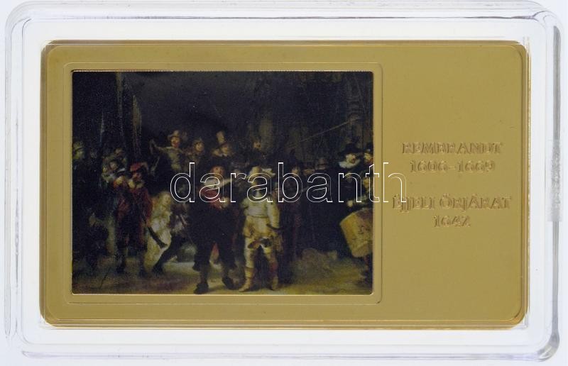 Beschreibung: DN "A világ leghíresebb festményei / Rembrandt 1606-1669. - Éjjeli őrjárat 1642." aranyozott, multicolor Cu emlékérem (35x60mm) T:PP